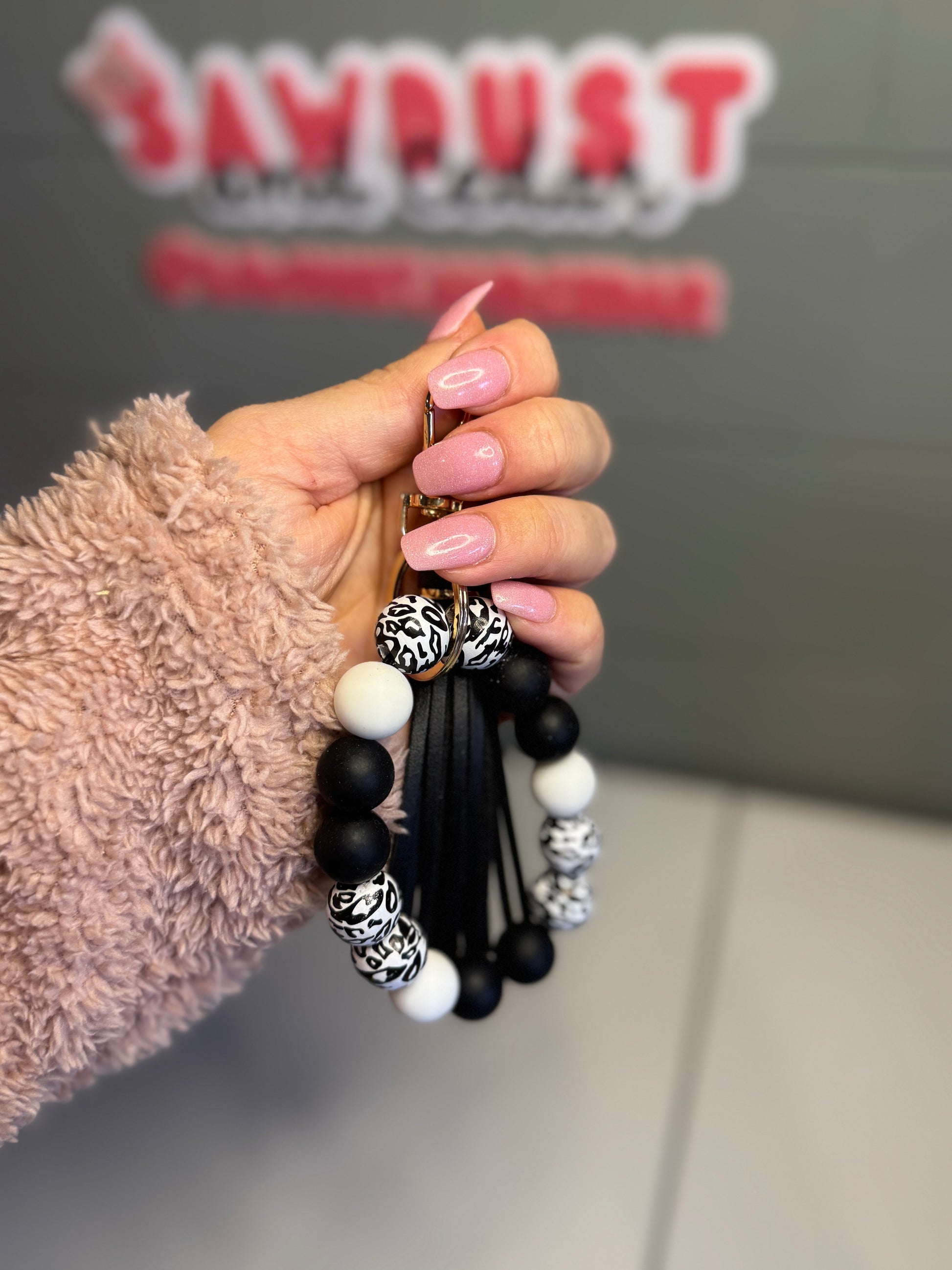 Timeless and bold, this wristlet combines black and white beads with striking leopard-print accents. The black tassel completes the sleek and modern design.