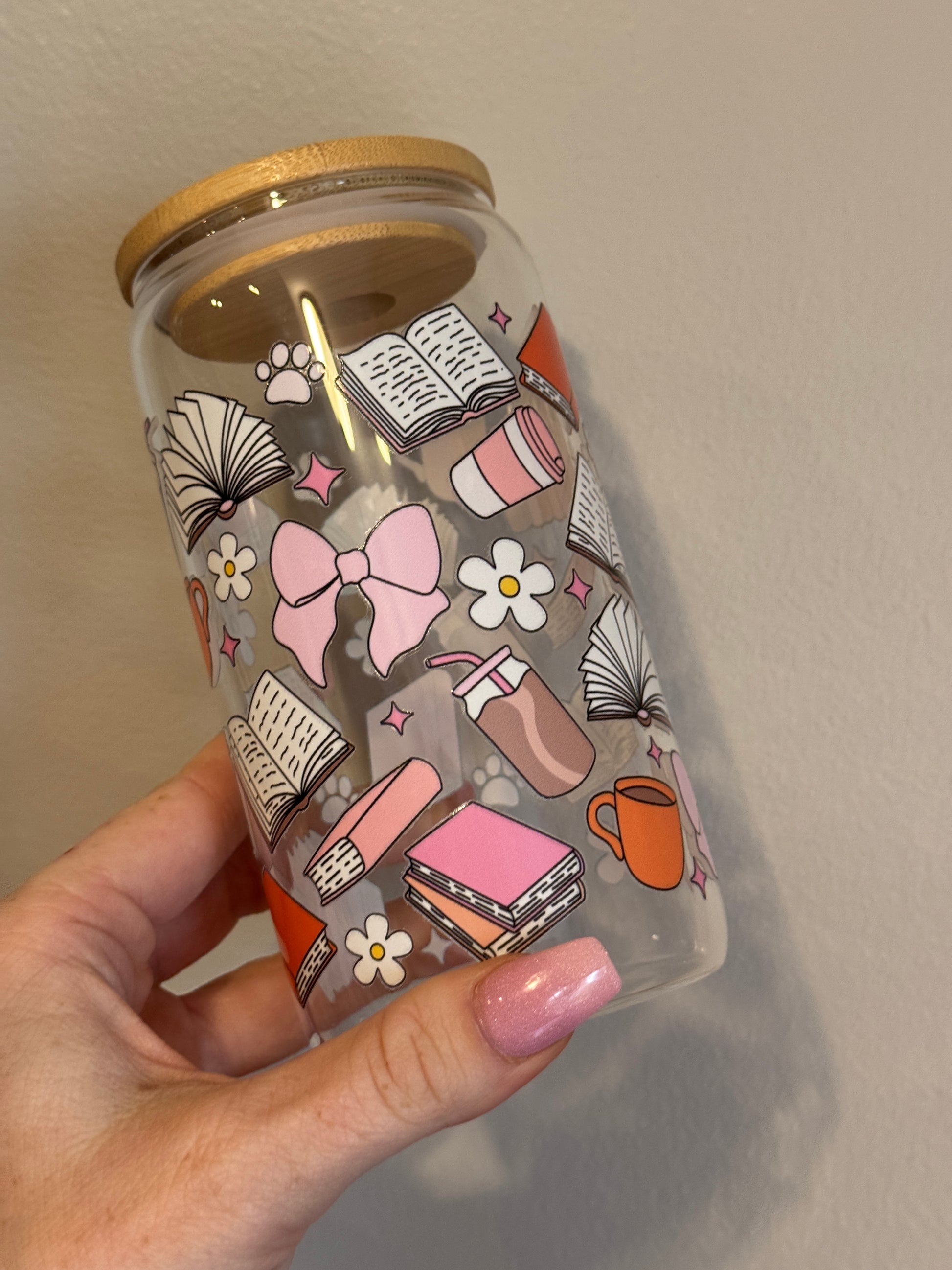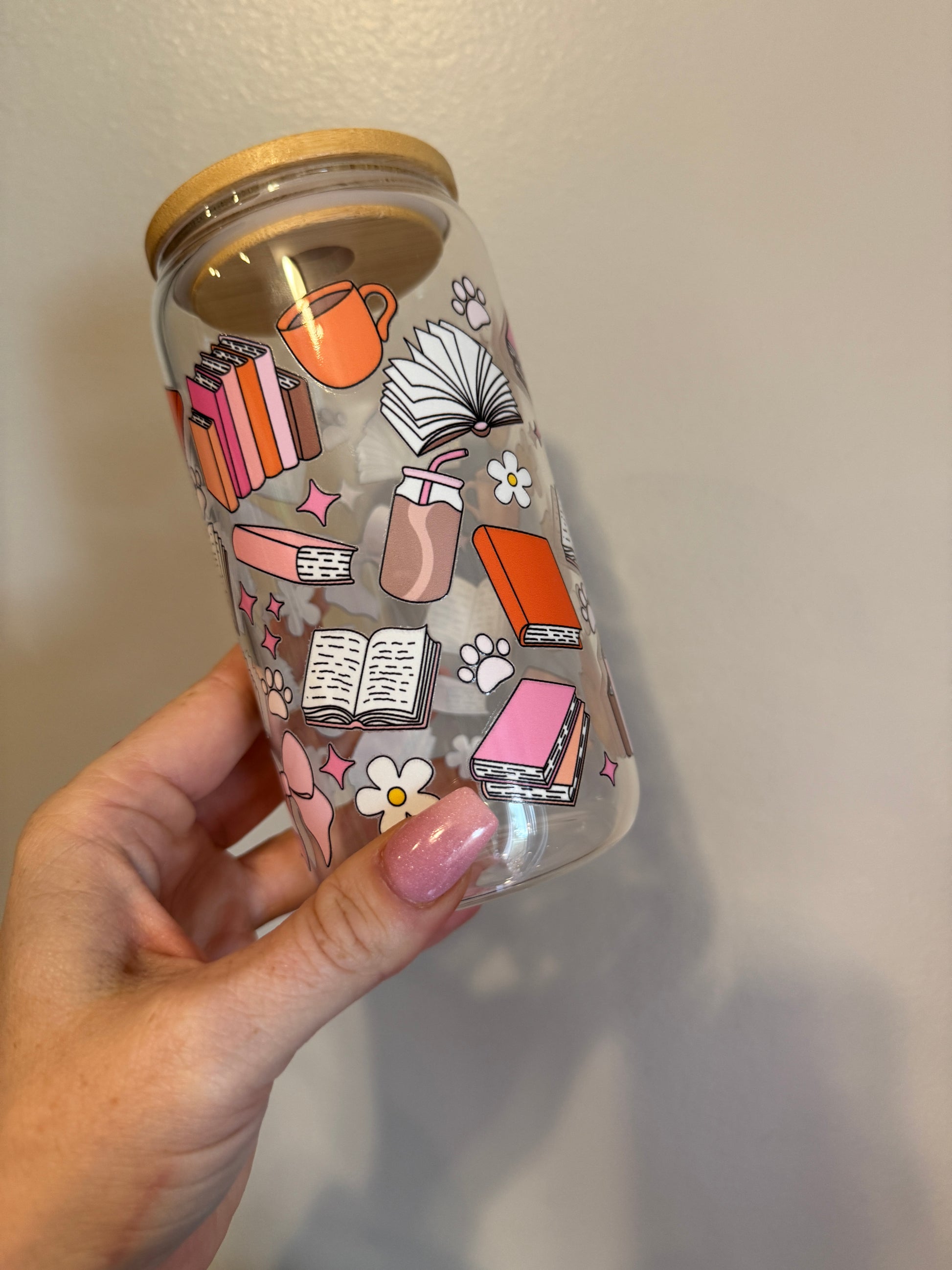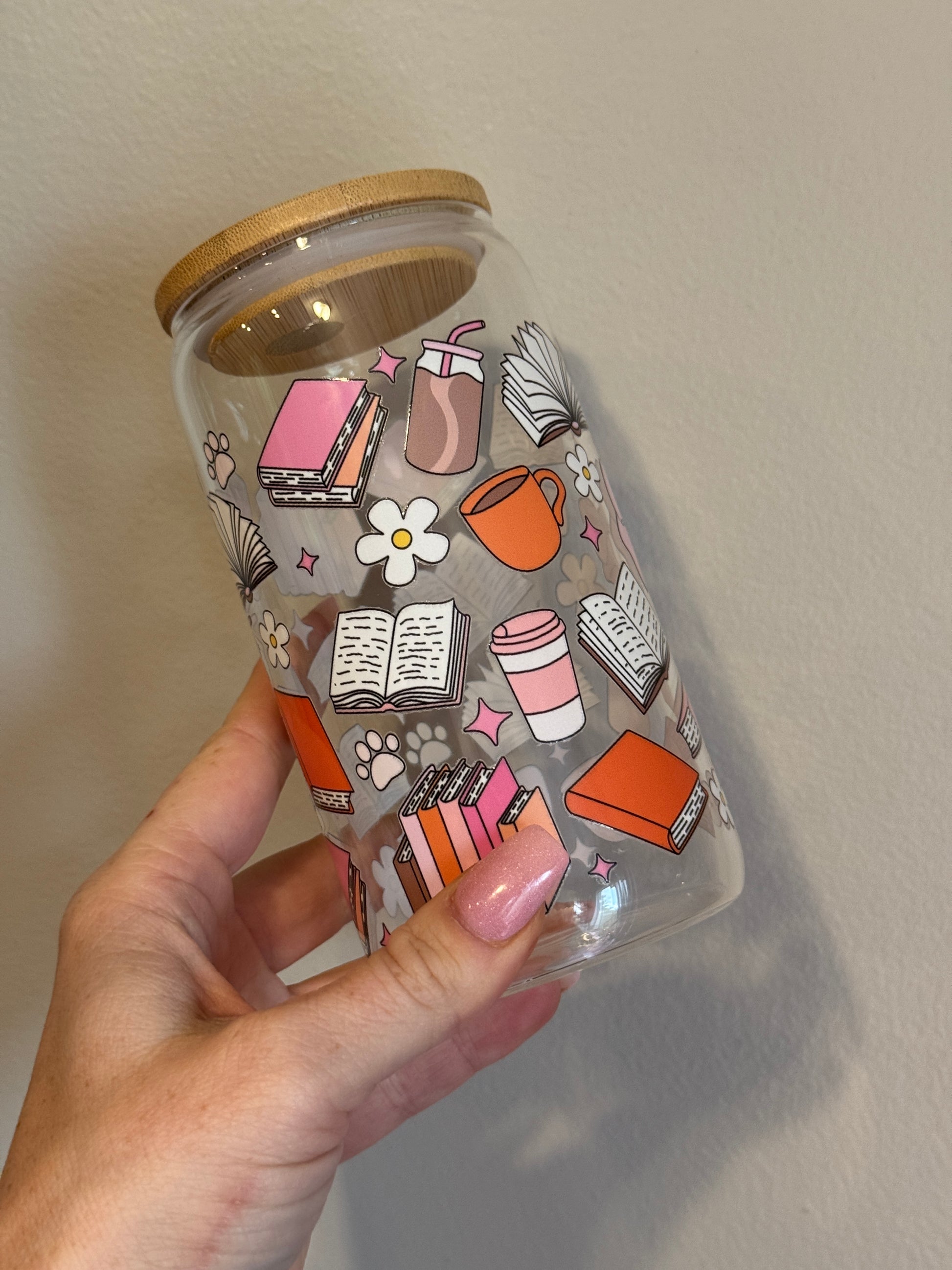 Calling all book lovers! The Books and Paws Cup is the perfect companion for your reading sessions. This 16oz glass tumbler features a charming design of open books, stacked novels, coffee cups, bows, and cozy aesthetic elements in soft pinks, oranges, and neutrals. Ideal for bookworms who love to sip on their favorite drinks while getting lost in a good story.