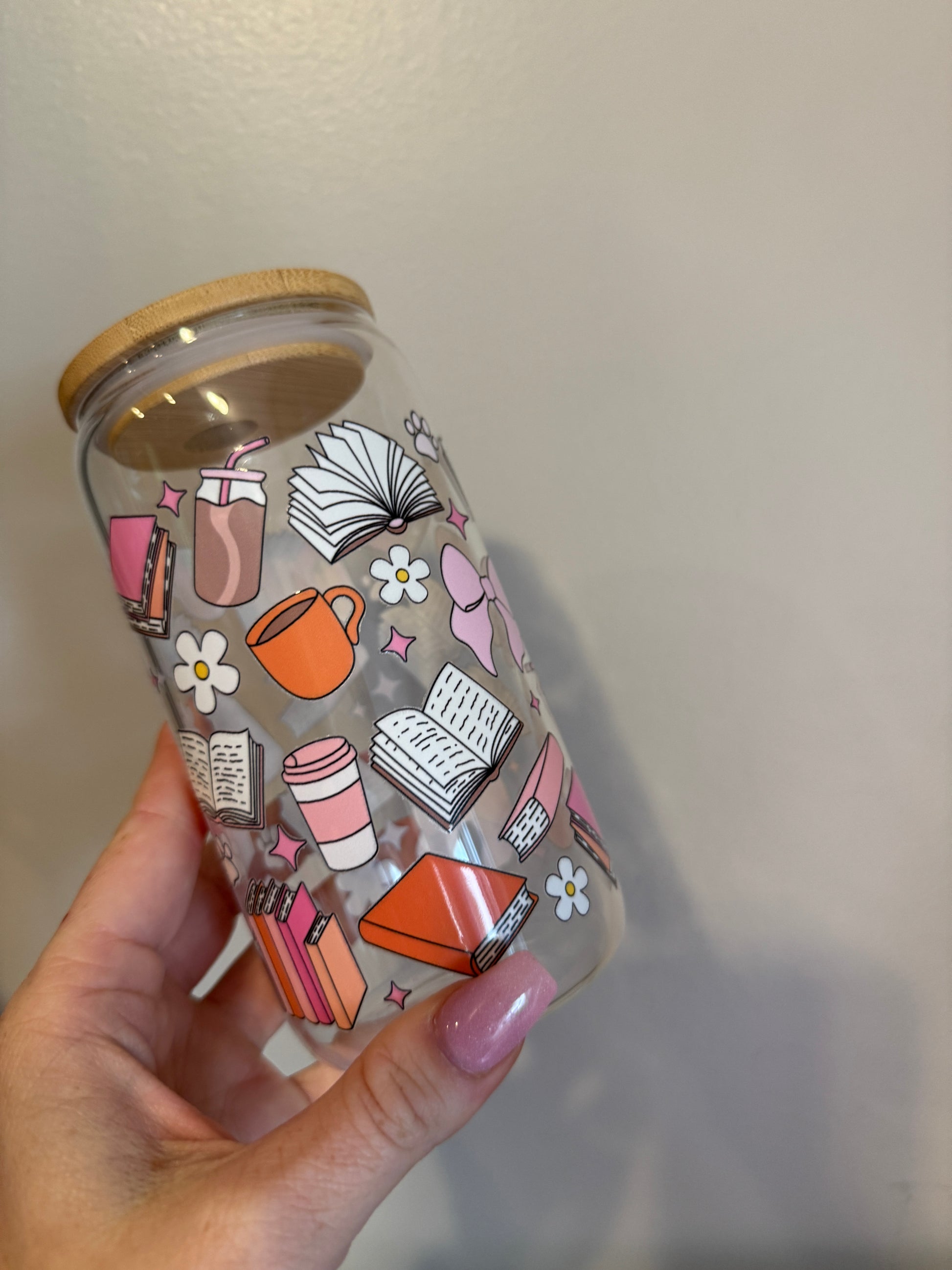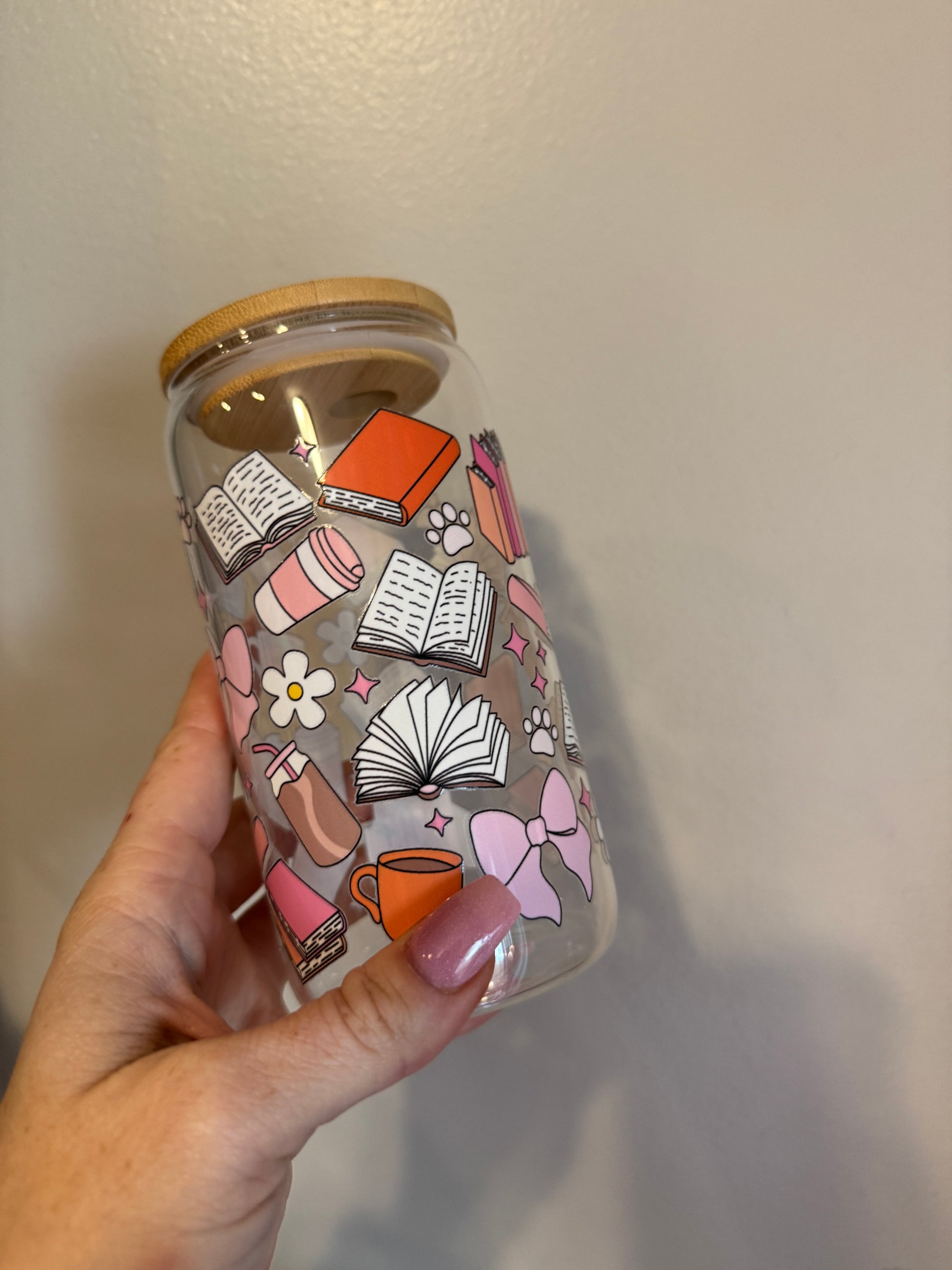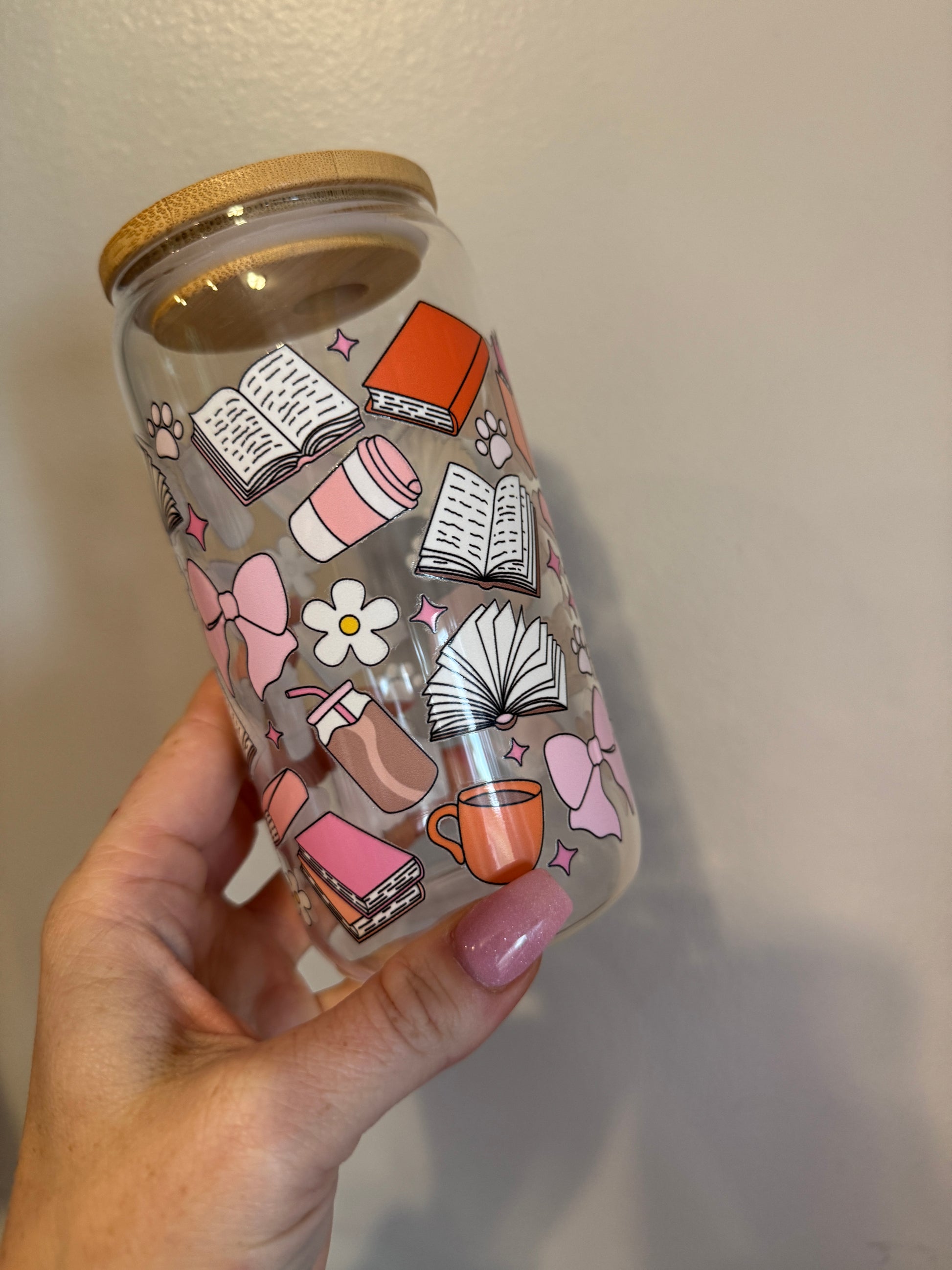 Calling all book lovers! The Books and Paws Cup is the perfect companion for your reading sessions. This 16oz glass tumbler features a charming design of open books, stacked novels, coffee cups, bows, and cozy aesthetic elements in soft pinks, oranges, and neutrals. Ideal for bookworms who love to sip on their favorite drinks while getting lost in a good story.