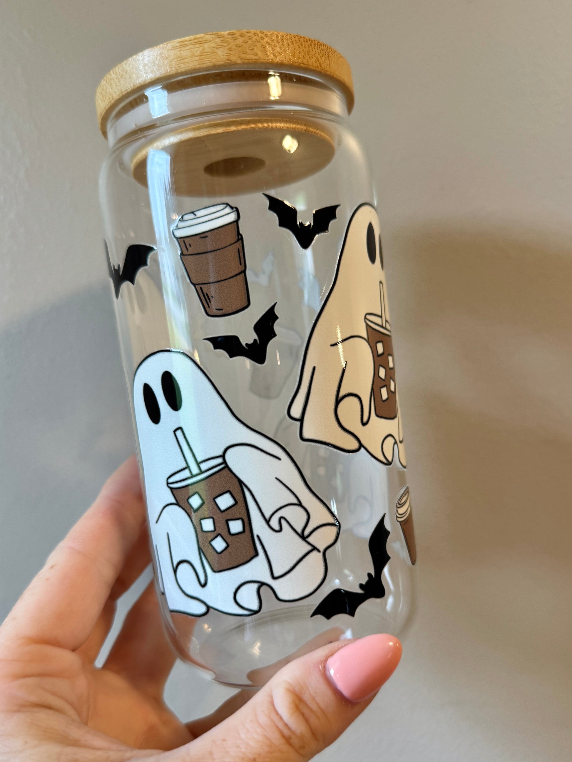 Sippin’ with spooky season! Adorable ghosts and coffee cups float with bats in this hauntingly cute design. For the Halloween coffee lover.