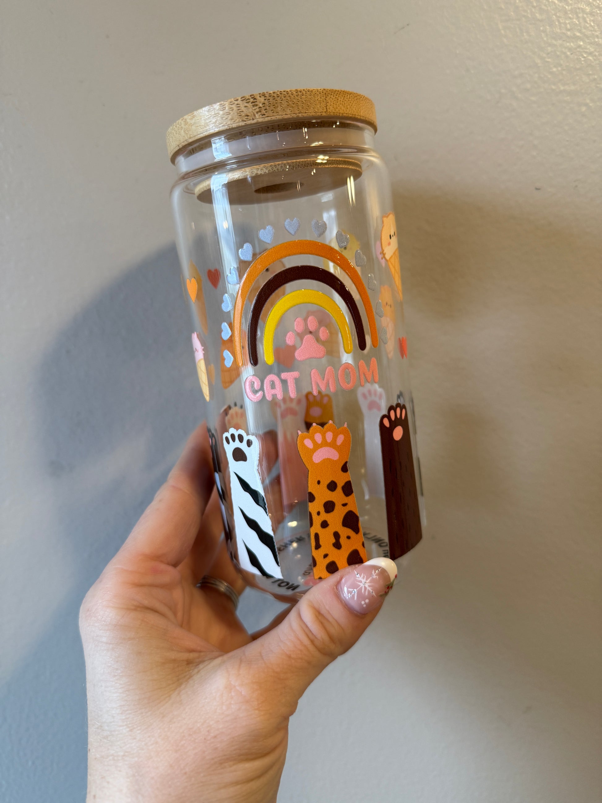 This Cat Mom glass can features a cozy mix of raised kitty paws, playful patterns, sweet hearts, and an adorable rainbow “Cat Mom” design. Celebrating cats of every color and personality, this cup is perfect for proud cat moms who love all things cute, cozy, and whimsical. Whether you’re sipping iced coffee, tea, or a sweet treat, this cup adds the purr-fect touch to your daily routine.