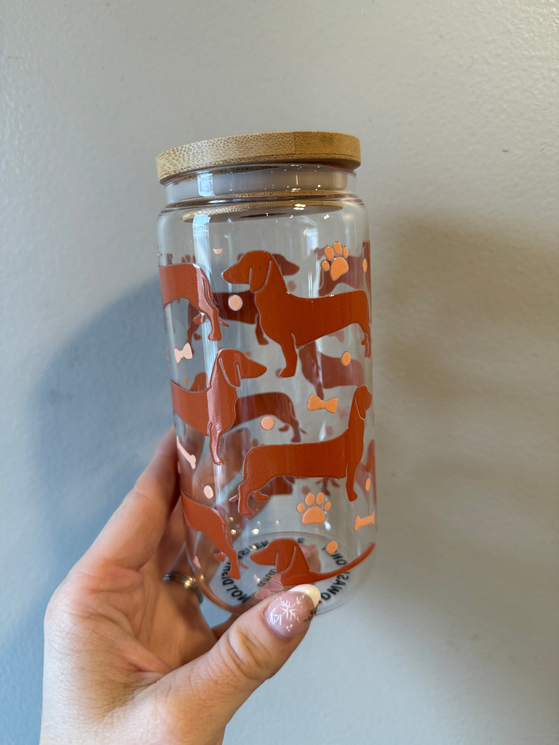 This Dachshund glass can features a playful pattern of long-bodied pups, paw prints, and sweet little details that perfectly capture the charm of everyone’s favorite weiner dog. With warm brown tones and an adorable silhouette design, this cup is a must-have for dachshund lovers, dog moms, and anyone who believes short legs make the biggest personalities. Perfect for iced coffee, tea, or daily sips.