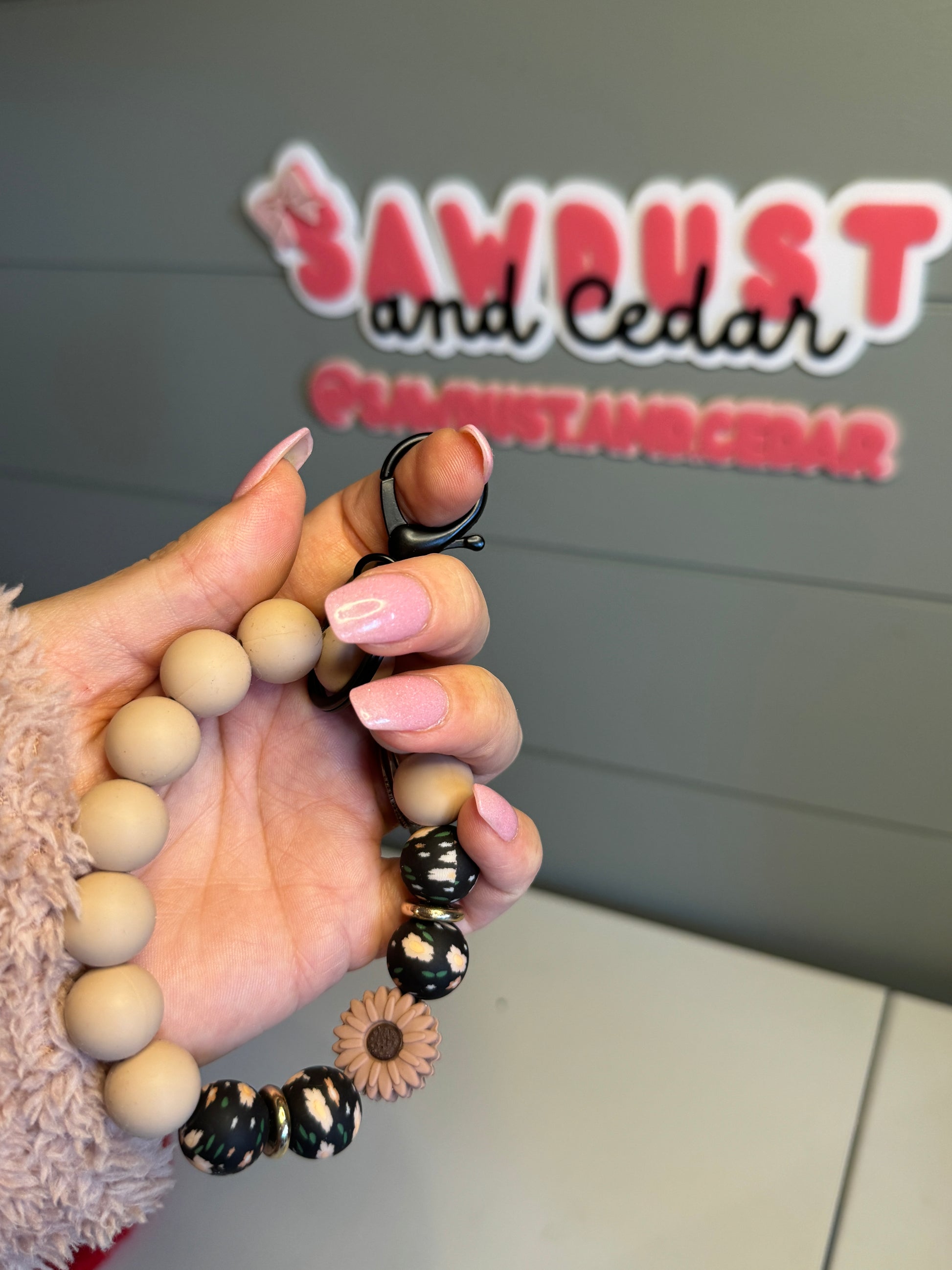 A chic and functional wristlet featuring earthy neutral tones and a standout sunflower charm. Perfect for securing your keys while adding a touch of nature-inspired elegance to your everyday accessories.
