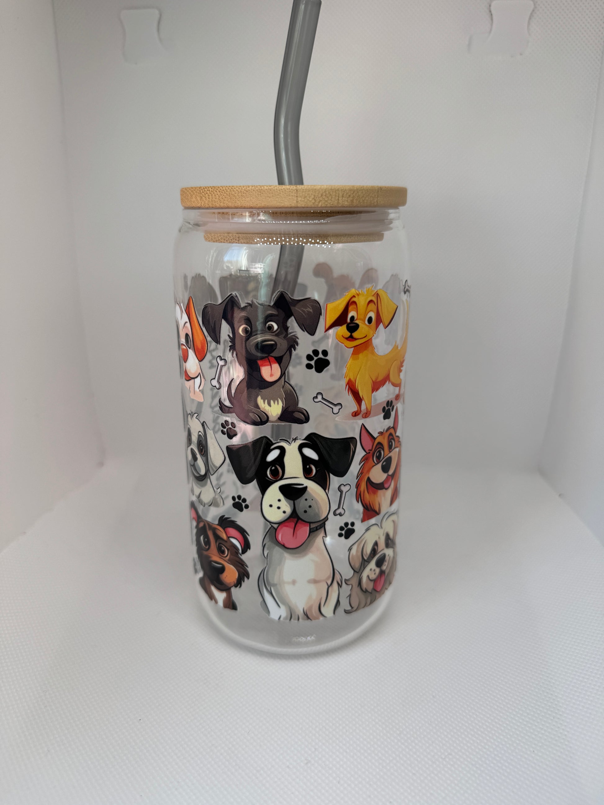 🐶 “Life is better with dogs”—and now, so is your drinkware! This 16oz clear glass can features cute illustrated pups and paw prints, making it the perfect cup for dog moms, dads, and pet lovers!