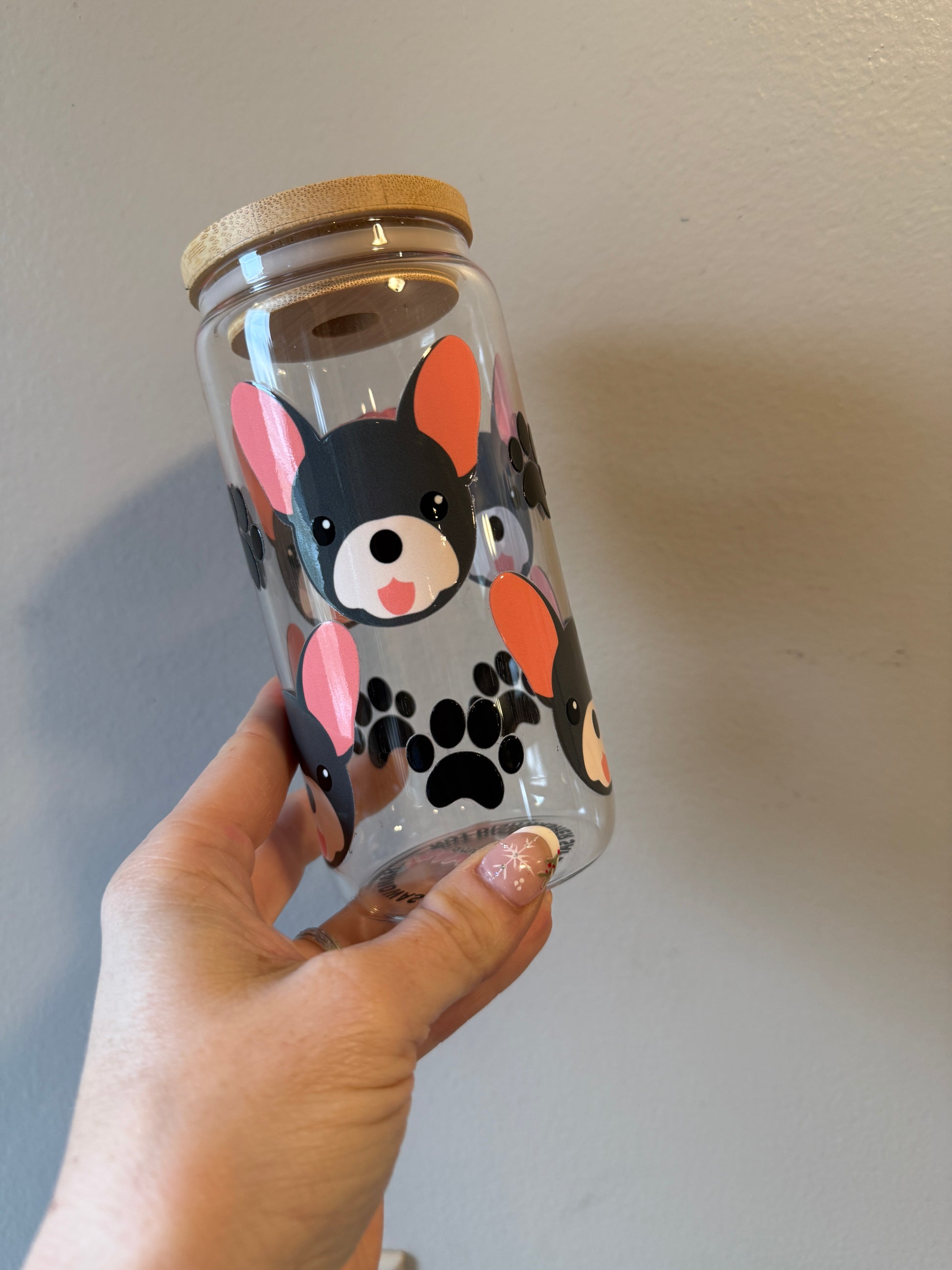 This French Bulldog glass can features an adorable, cartoon-style Frenchie with signature bat ears, playful paws, and a sweet, happy expression. Known for their big personalities and loyal hearts, Frenchies make the perfect everyday companion—now in cup form. A must-have for Frenchie moms, dog lovers, and anyone who loves a fun, cozy sip moment.
