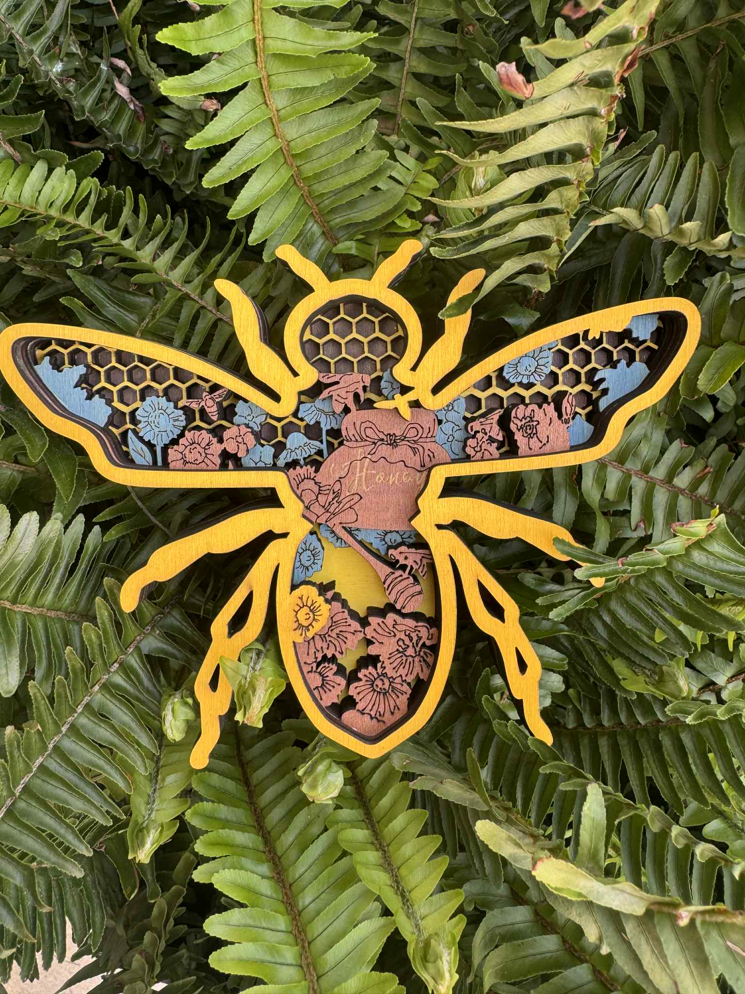 This layered wood design features a honey bee shape with honeycombs and flowers inside.