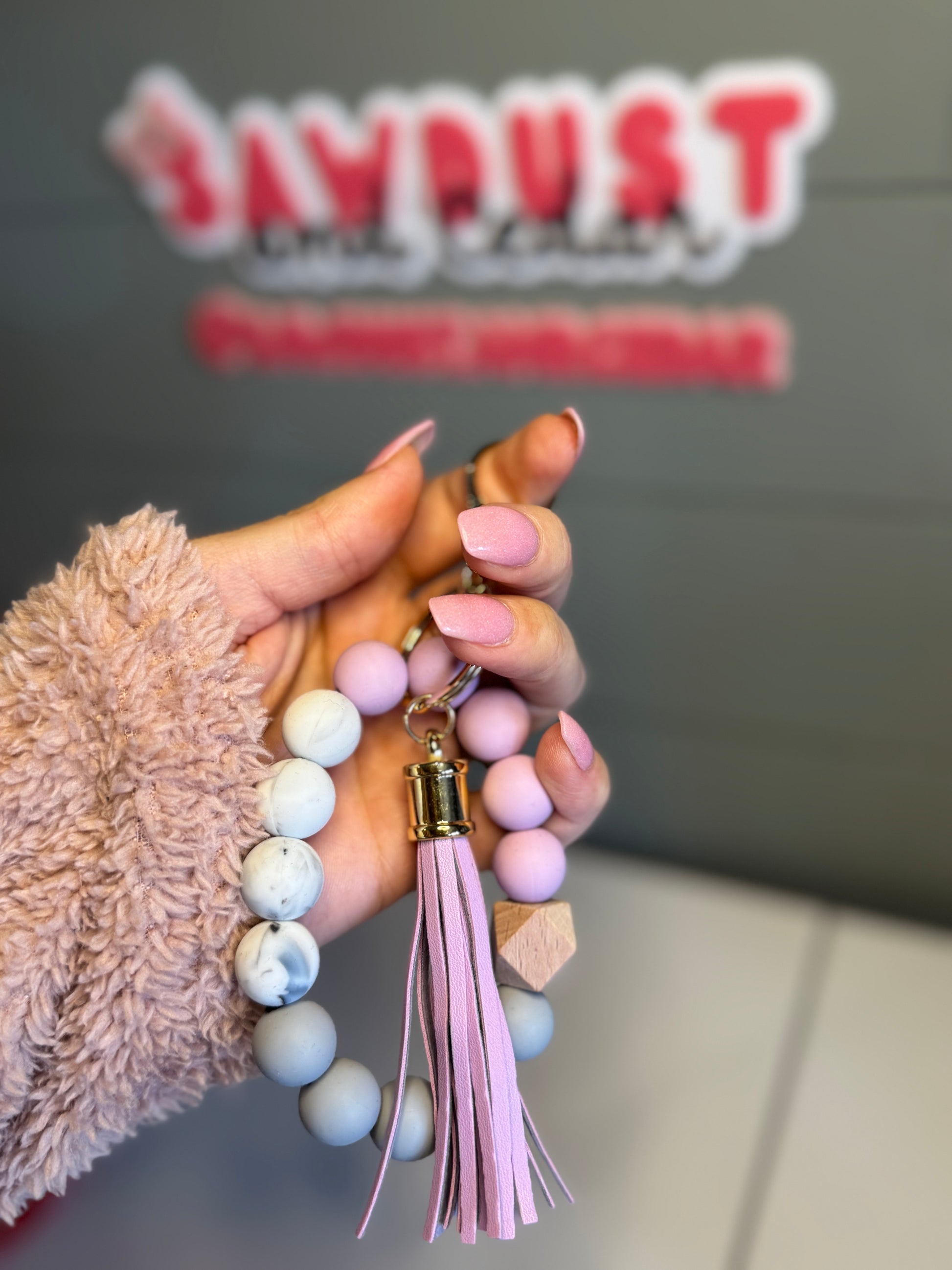 A soft and elegant design combining lilac tones and marbled beads with a delicate wooden accent. Finished with a blush tassel, this wristlet is a sophisticated choice for minimalist yet stylish everyday use.