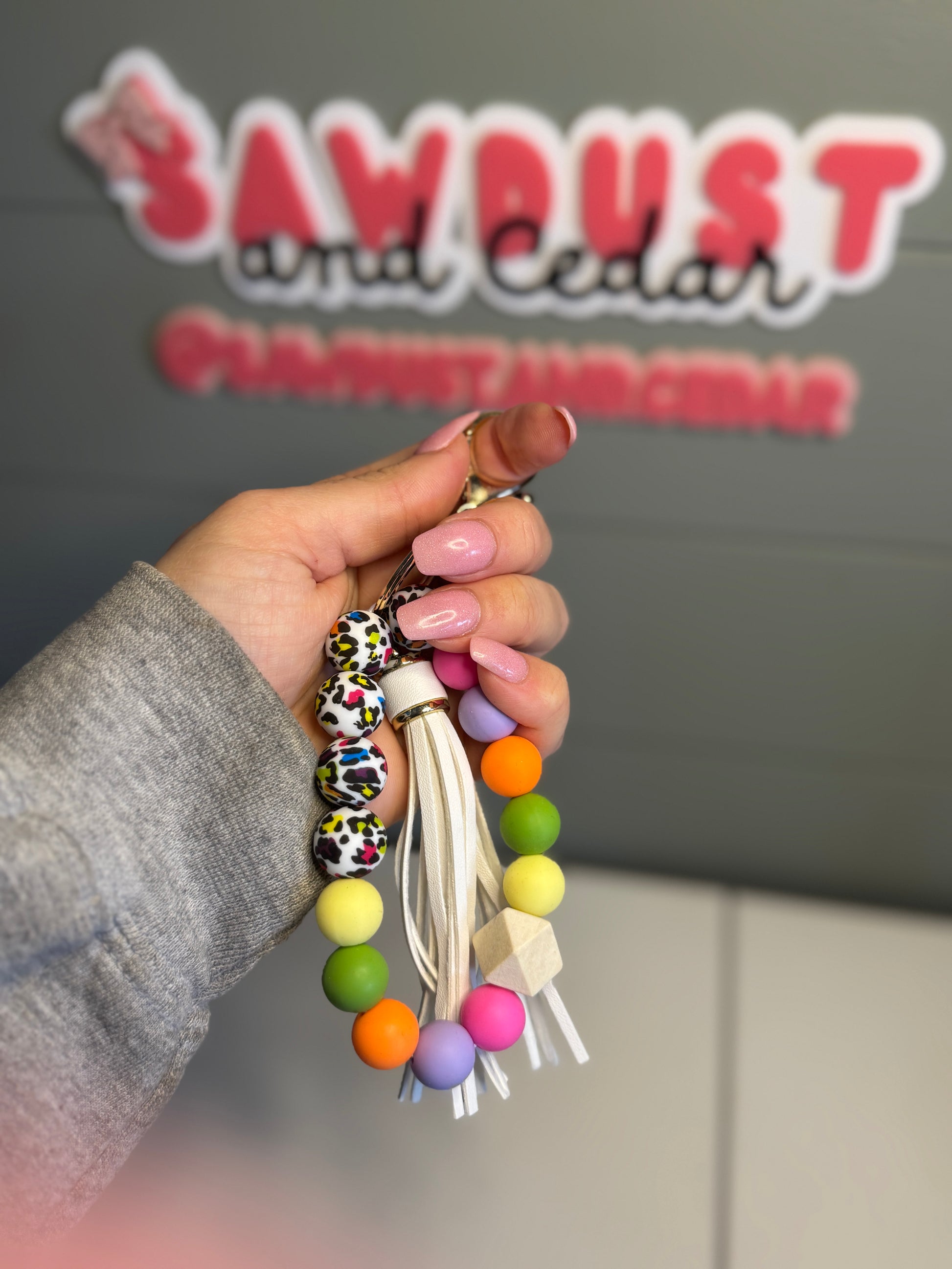 Playful and vibrant, this wristlet features bold rainbow tones and leopard-print beads, paired with a wooden geometric bead and cream tassel. A fun accessory to brighten your day.
