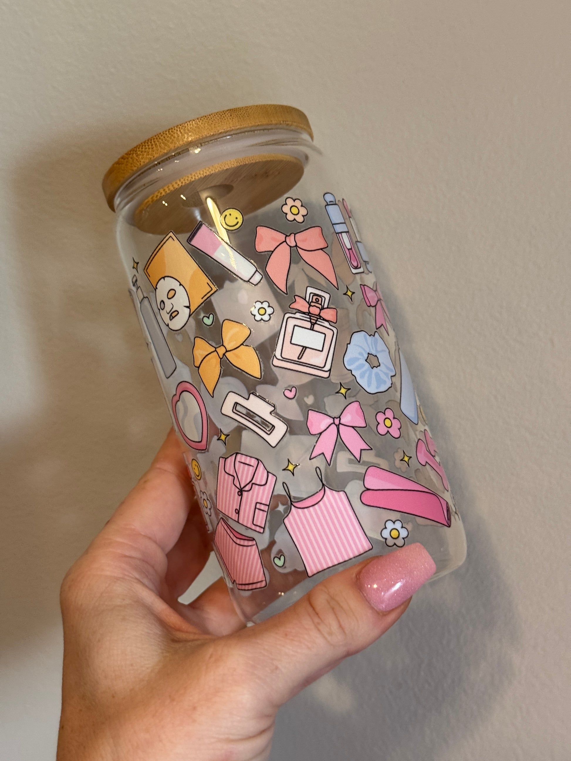 Prioritize self-love and wellness with our Self Care Girly Glass Cup. Designed with a soft pastel aesthetic, this 16oz glass features charming illustrations of bows, healing bandages, flowers, and cozy self-care essentials. Perfect for nurses, healthcare workers, or anyone who values mental and physical well-being, this cup is both functional and adorable!