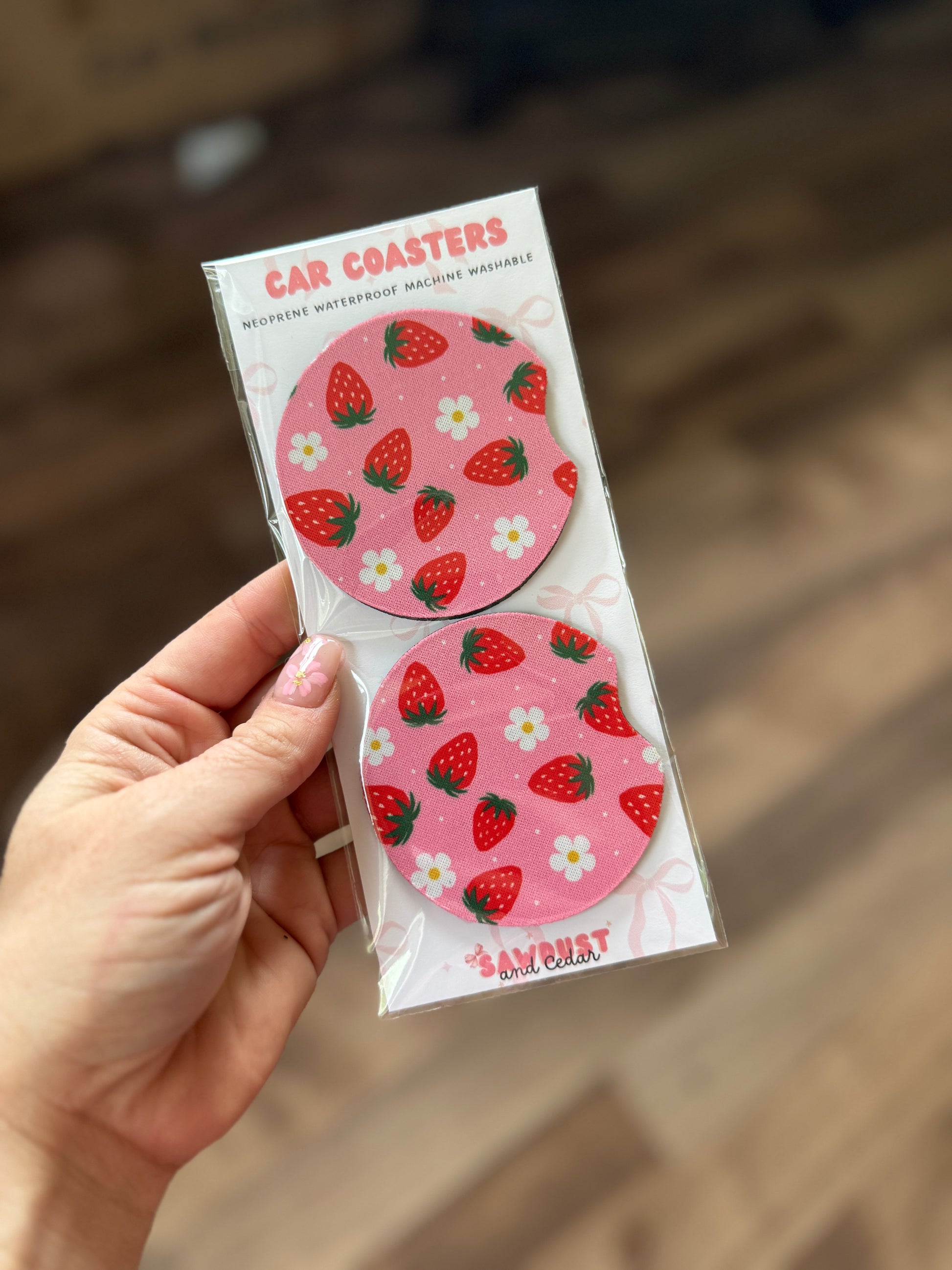 Strawberries and daisies on a bubblegum pink background—this one’s as sweet as it gets. Match your Berry Sweet car coasters with coordinating Chapstick holders and claw clips for the cutest summer set.
