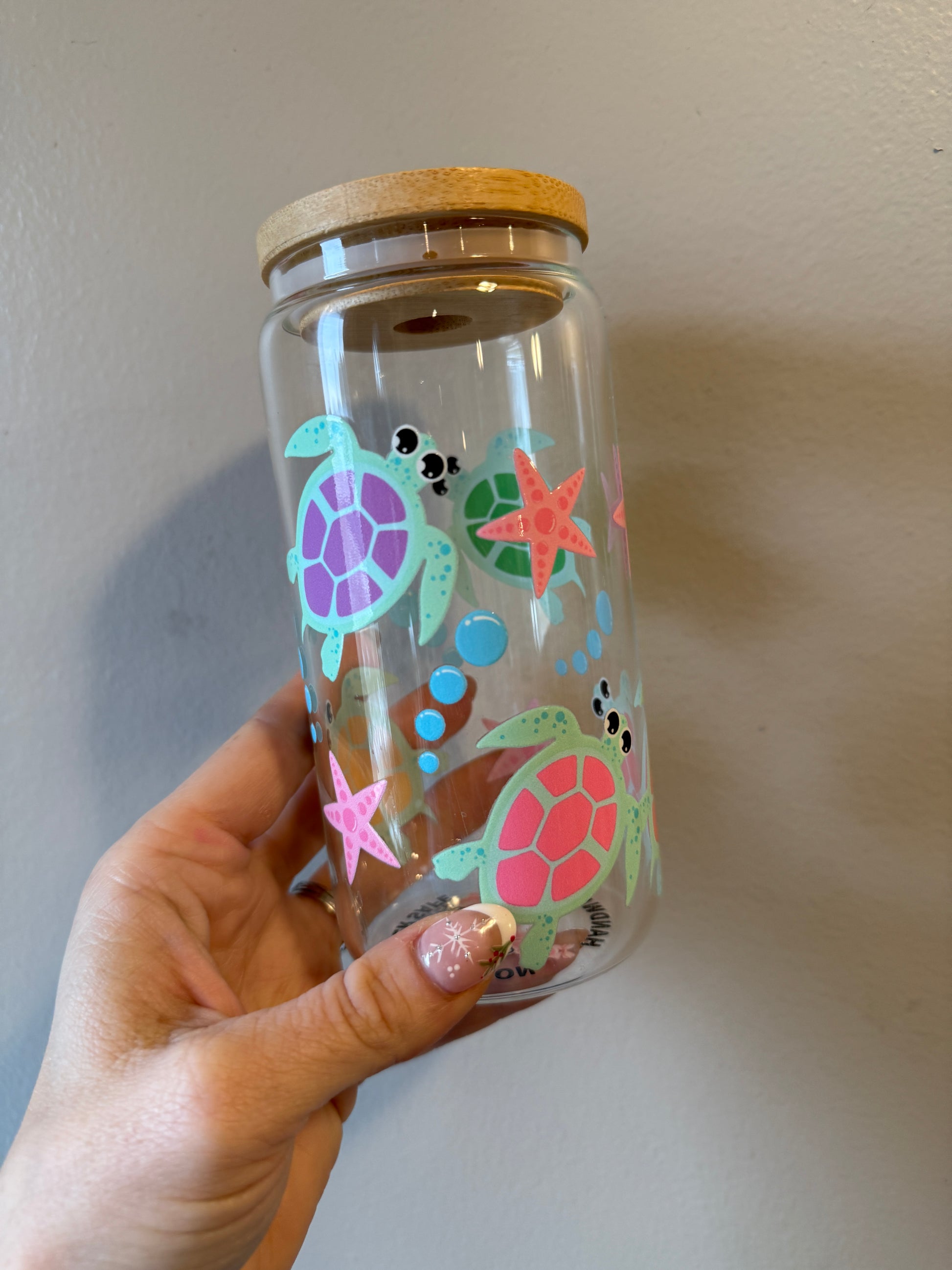 This Sweet Sea Turtle glass can features adorable pastel sea turtles swimming among bubbly ocean details and cheerful starfish. With its soft colors and playful underwater design, this cup brings calm coastal vibes and a touch of whimsy to every sip. Perfect for iced coffee, tea, or a refreshing summer drink, it’s a must-have for ocean lovers and turtle fans alike.