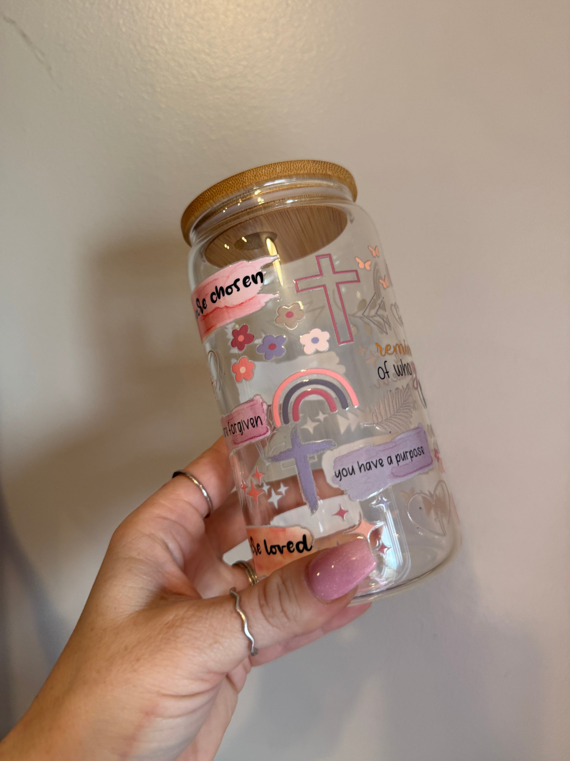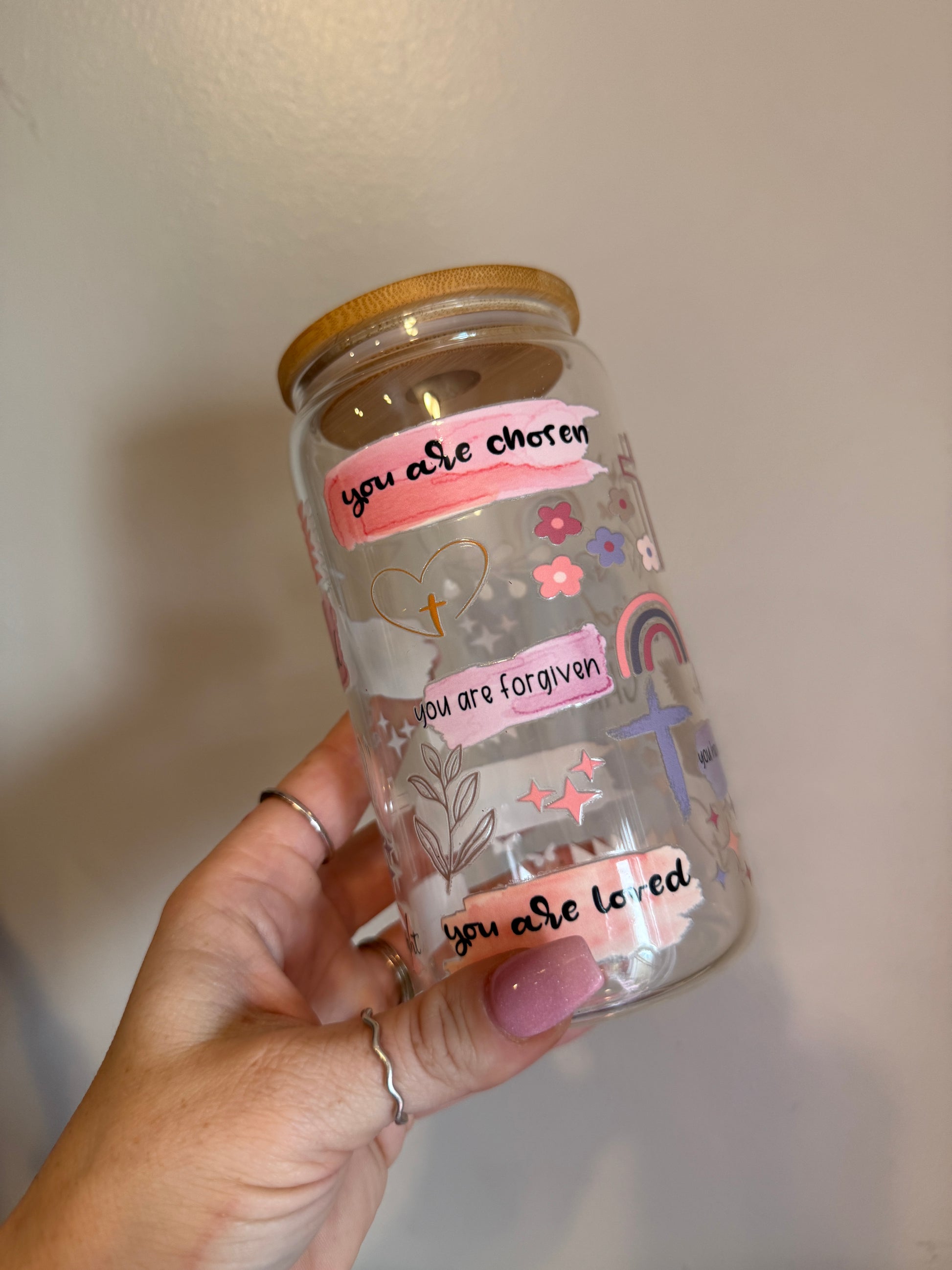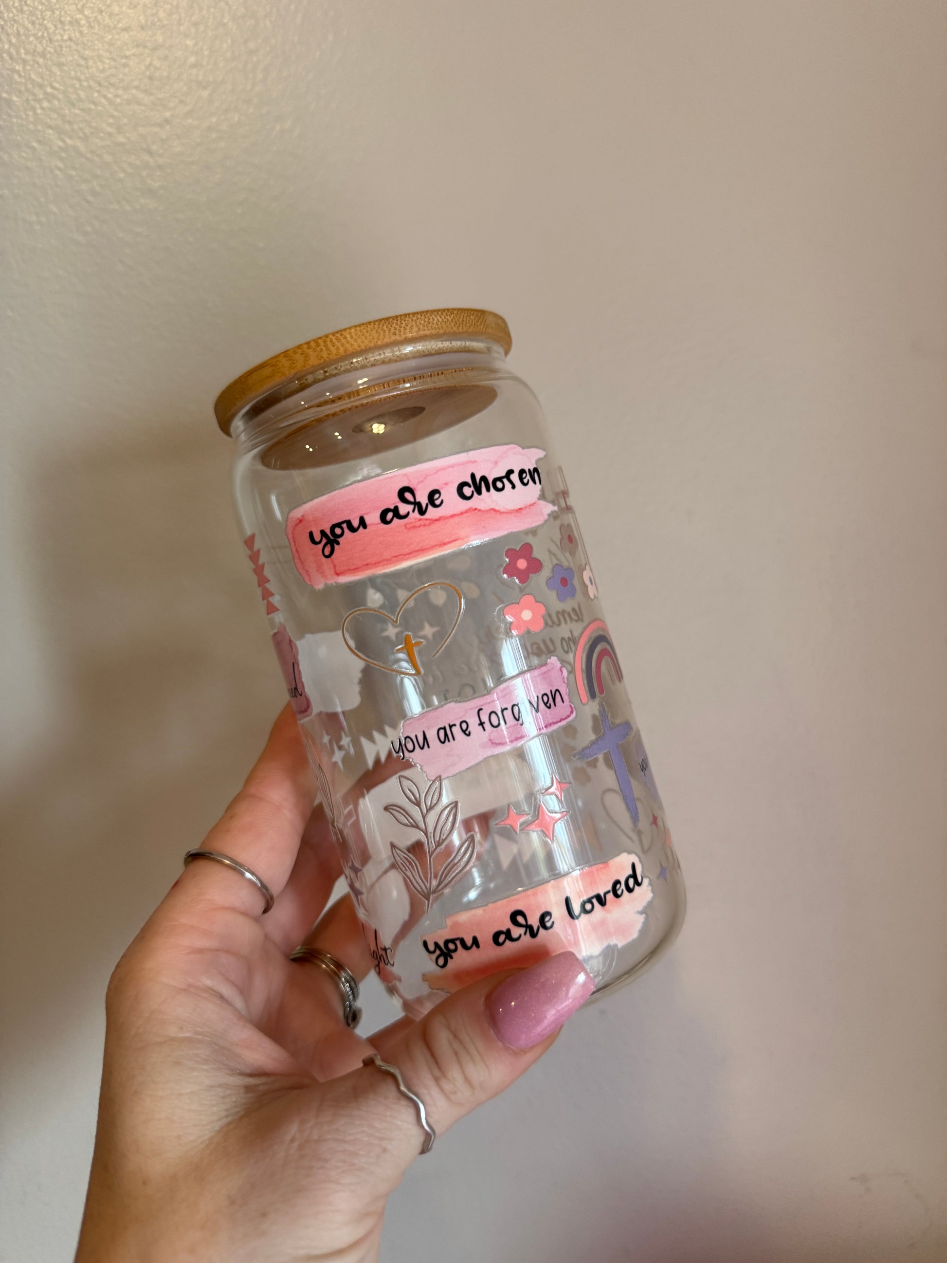 Find daily encouragement with the Faith & Grace Cup—a beautifully designed 16oz glass tumbler that serves as a reminder of love, faith, and grace. Featuring uplifting hand-lettered messages “You are chosen,” “You are forgiven,” and “You are loved” in soft watercolor-inspired banners, this cup is adorned with delicate floral accents, a cross, and a pastel rainbow.