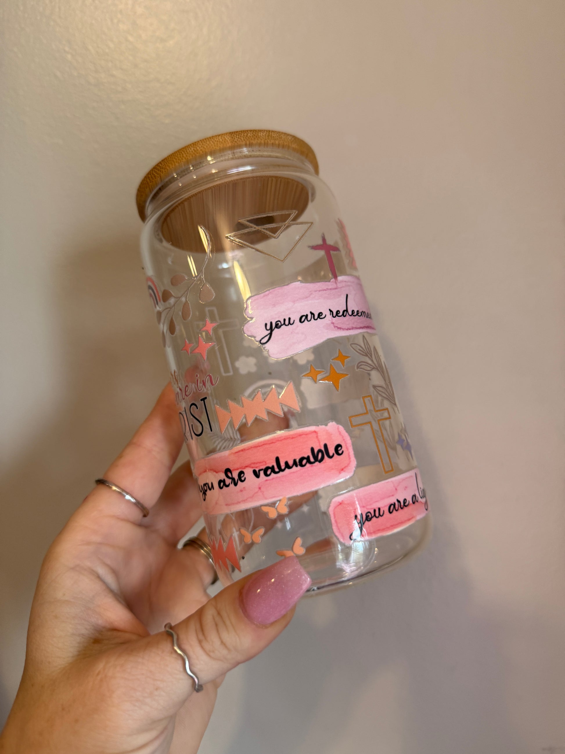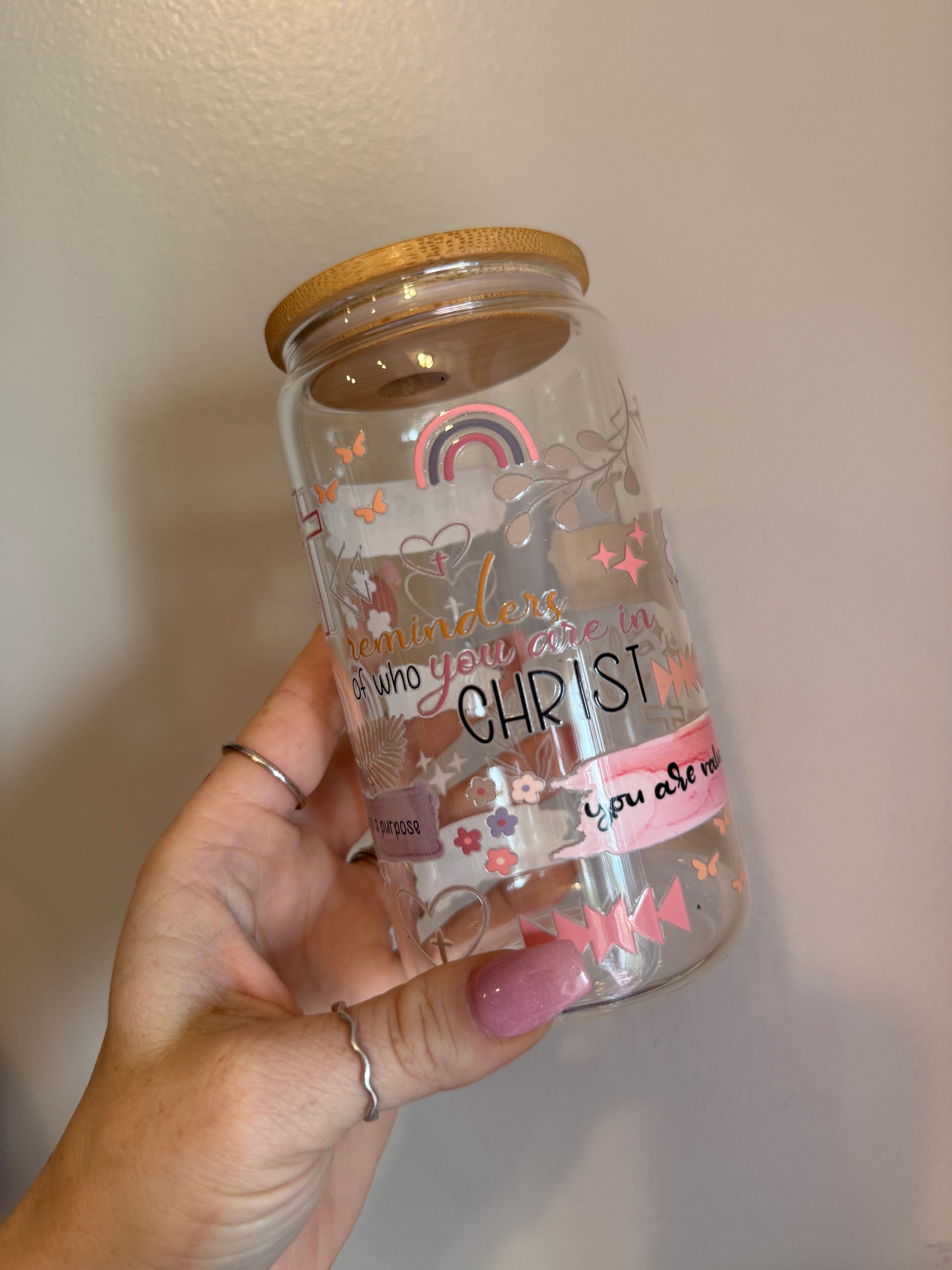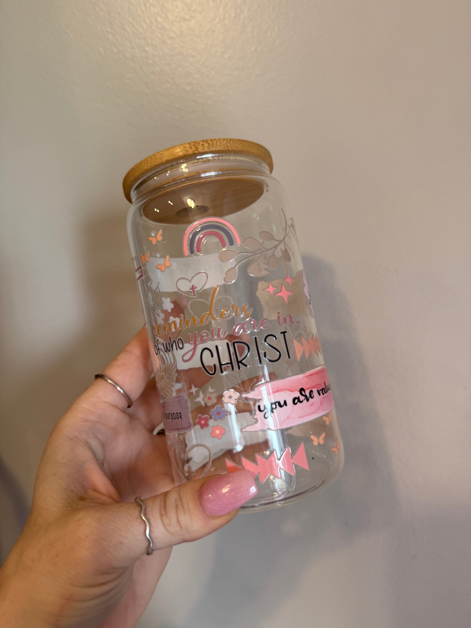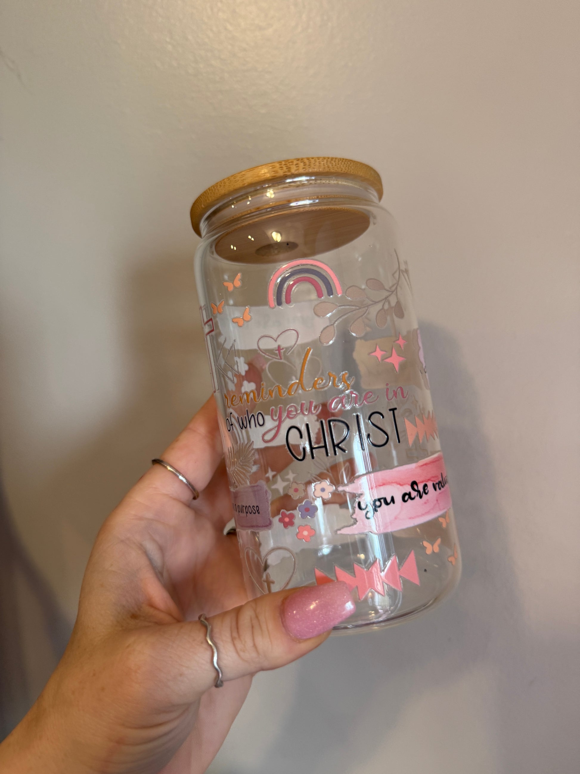 Find daily encouragement with the Faith & Grace Cup—a beautifully designed 16oz glass tumbler that serves as a reminder of love, faith, and grace. Featuring uplifting hand-lettered messages “You are chosen,” “You are forgiven,” and “You are loved” in soft watercolor-inspired banners, this cup is adorned with delicate floral accents, a cross, and a pastel rainbow.